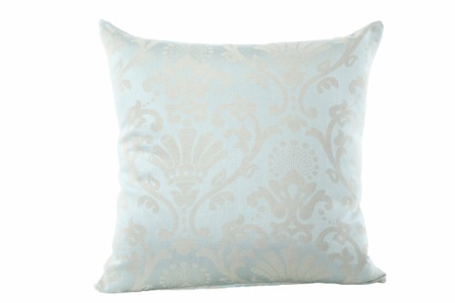 This pillow has a dark sea gray polyester jacquard cover with a floral pattern. It measures 12 x 15 x 5 inches in size. It has hidden zipper on one side. The cover can be removed for cleaning; Professional dry clean only.