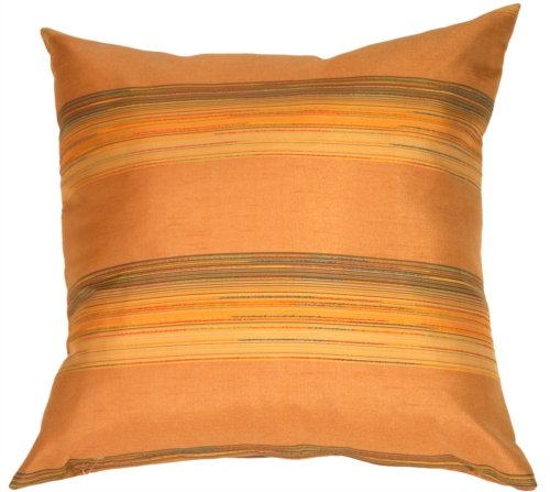 This fabric is reminiscent of a desert horizon, with a background of muted soft, warm orange. The raised stripes have textured threads of deep taupe, blue green, warm gold, rose rust, teal blue, and medium yellowy greens. The practical 100% polyester fabric has a texture that imitates silk. An appropriate sized decorative pillow for a loveseat or sofa.